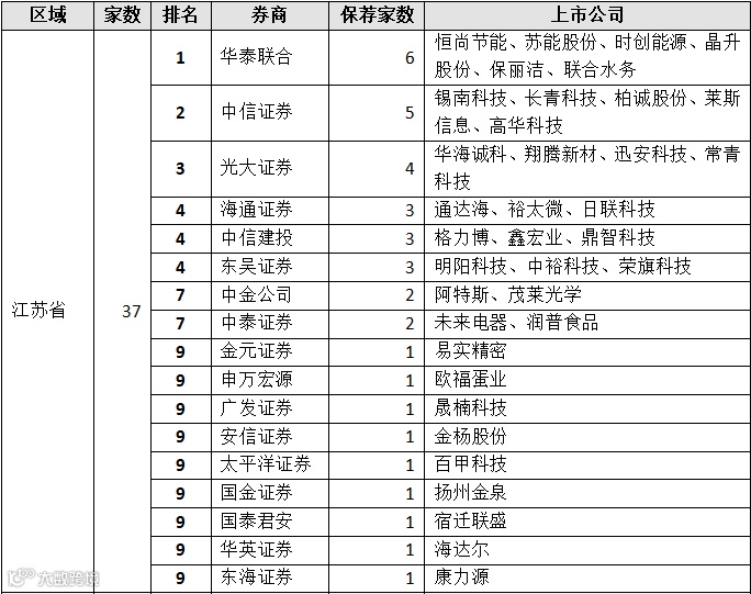 根据上市公司注册地统计,如前所述,江苏省、浙江省、广东省分别有37家、29家、19家上市公司完成A股IPO,位居前三。在2023年上半年IPO数量最多的的江苏省,华泰联合、中信证券、光大证券分别保荐6家、5家、4家,位居区域前三。