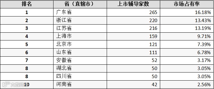 表:全国省(直辖市)A股IPO市场已上市公司家数排名(前十名)