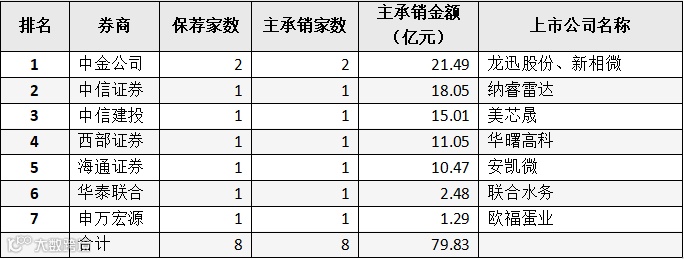 券商方面,中信证券保荐19家,中信建投主承销292.61亿元,家数、金额分别位居行业第一。与此同时,申万宏源承销家数与去年同期相比上涨50%,跃居第六位;国信证券与东吴证券也杀入前十,券商表现呈现出“百花齐放”的新格局。