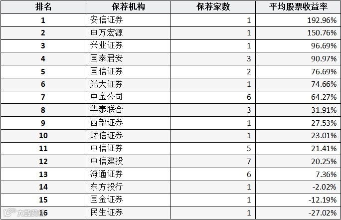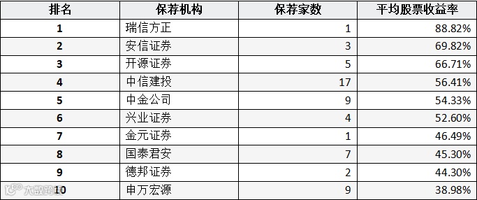 表:券商完成IPO发行上市公司平均股票收益率统计(前十名)
