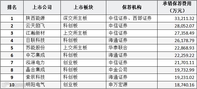 在所有保荐机构中,收取IPO承销保荐费用最高的为中信证券,具体排名如下表所示: