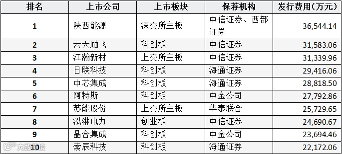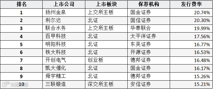 表:上市公司IPO发行费率排名表(前十名)