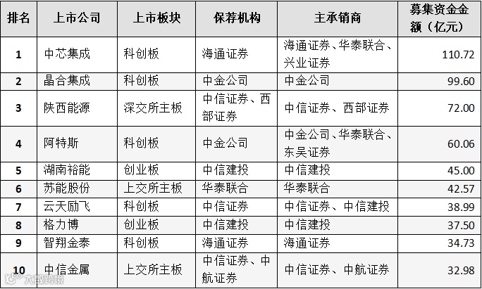 表:A股IPO募集资金金额排名(前十名)