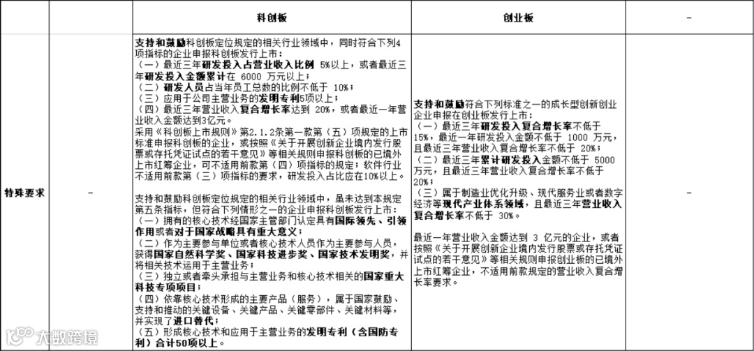 除上述发行指标及财务指标外,科创板与创业板还对研发投入、增长率等指标存在特殊要求,具体如下: