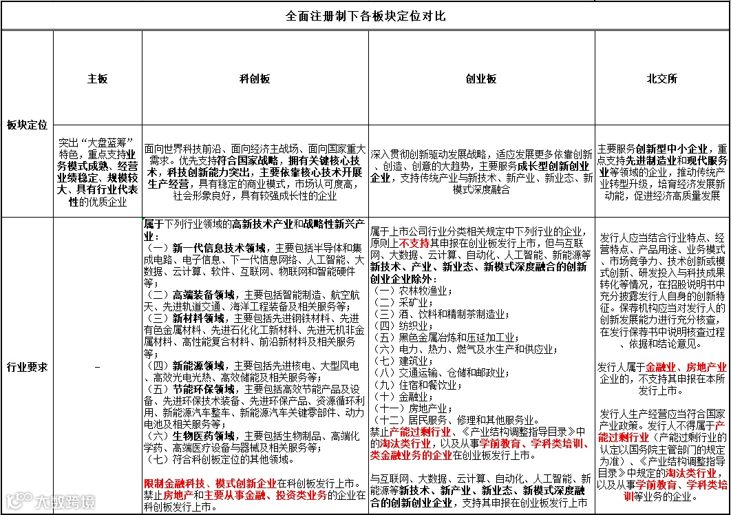 笔者认为,在本次全面注册制改革后,各板块间差异将进一步放大。主板主要服务于成熟期大型企业,起到稳固市场,兜底风险的“压舱石”作用;科创板突出“硬科技”特色,发挥资本市场改革“试验田”作用,培养一批科研先锋企业,服务于国家重大战略目标;创业板主要服务于成长型创新创业企业,助力符合“三创四新”条件的大中型企业进一步做大做强;北交所与全国股转系统共同打造服务创新型中小企业主阵地。