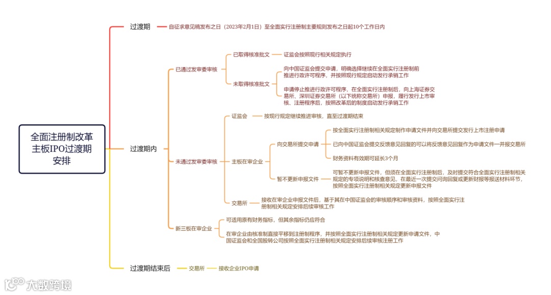 过渡期内已过会但未取得核准批文的企业,可以选择继续按原有规定推进上市程序,也可以申请停止原有程序,转向交易所申报,并按全面注册制改革后的新规履行审核、注册程序;过渡期内仍处于问询过程中的企业,可以按新规制作申请文件并向交易所申报,已向证监会提交的问询回复可以作为材料一并提交。在全面实行注册制新规尚未真正落地前,申报文件可以暂不更新,待新规落地后,在最近一次报送材料的环节中,由中介机构提交符合全面实行注册制规定的专项核查意见,并按新规更新申报文件。
