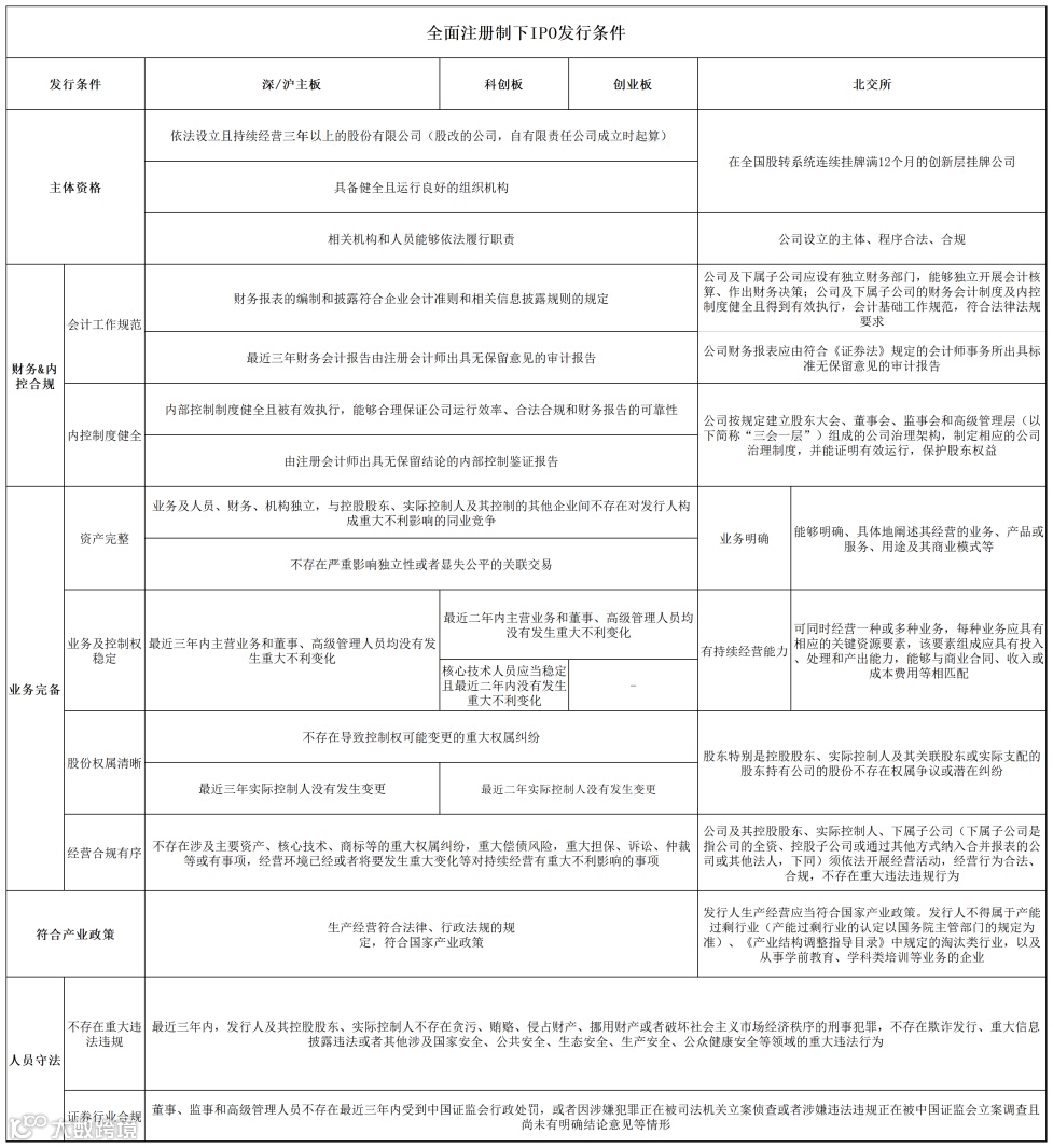 中国证监会希望通过本次全面注册制改革统一注册制度与规则,形成统一的发行注册管理办法,北交所注册制制度规则与上交所、深交所总体保持一致。各板块发行条件具体梳理如下: