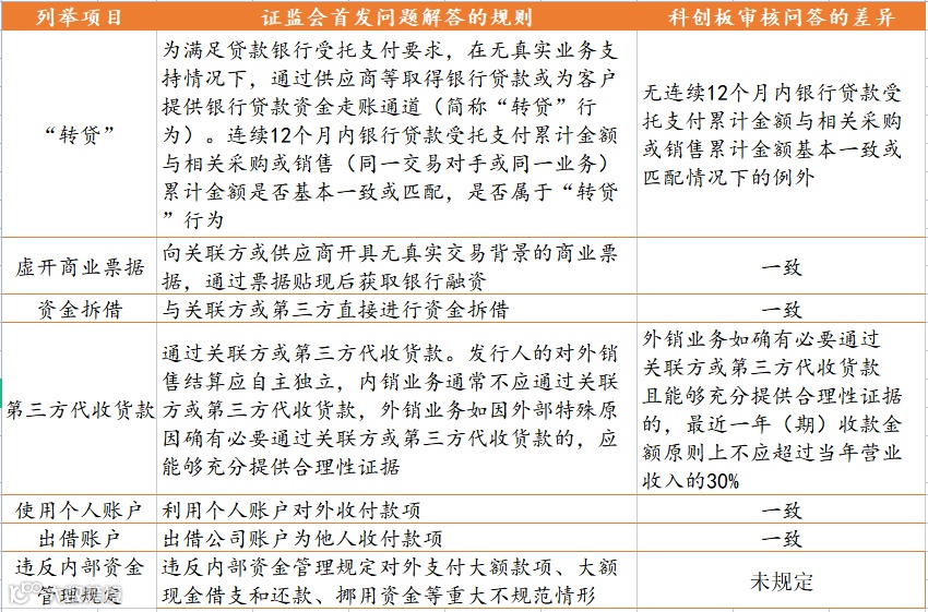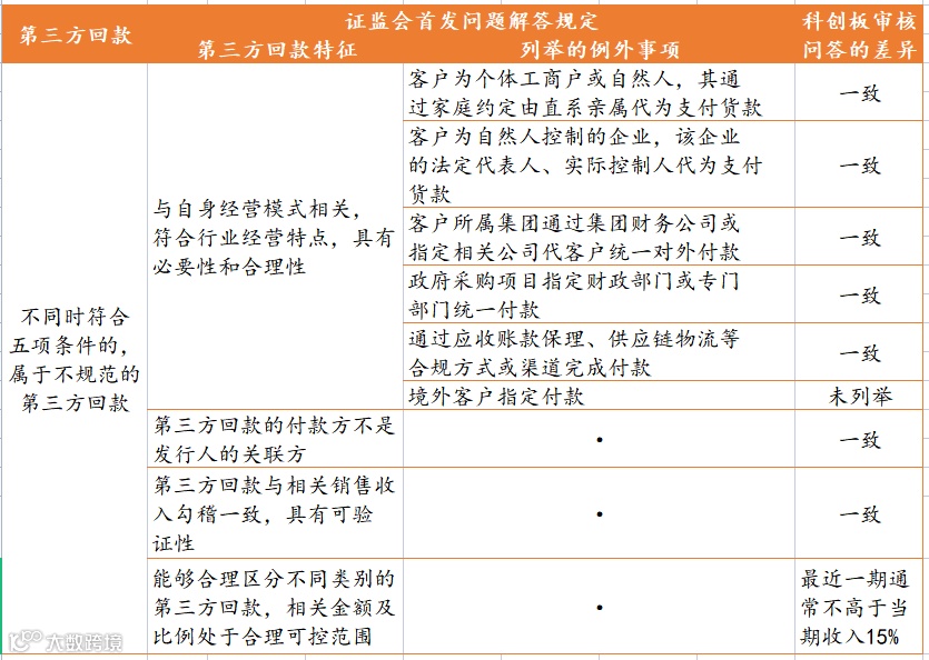 证监会首发问题解答和科创板审核问答关于第三方回款规定的比较: