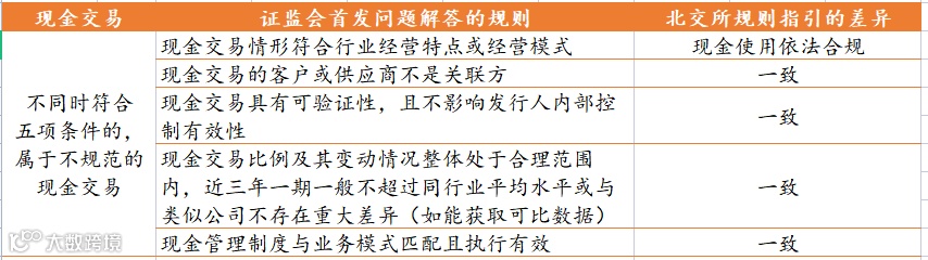 证监会首发问题解答和北交所规则指引中关于现金交易的规定比较: