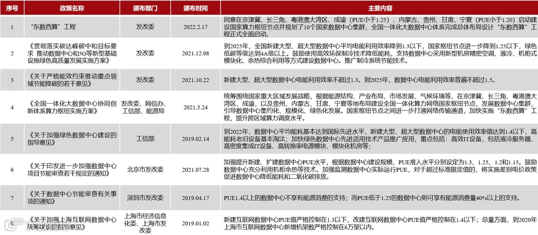在“双碳”大背景下,国家发改委及一线城市陆续出台数据中心节能政策,相关政策对数据中心PUE值(数据中心能源效率的指标,是数据中心消耗的所有能源与IT负载消耗的能源的比值)进行严格限制,旨在总量限制基础上推进绿色数据中心建设,严格控制数据中心能耗增长。同时,“东数西算”工程在2022年2月17日全面启动,未来将建成8个国家算力枢纽节点,并规划10个国家数据中心集群,2022年成为中国IDC的元年。“东数西算”工程同样对PUE值进行了严格规定,其中,京津冀、长三角、粤港澳大湾区和成渝地区四大国家算力枢纽节点的PUE需小于1.25,内蒙古、贵州、甘肃和宁夏四大国家算力枢纽节点的PUE需小于1.2。
