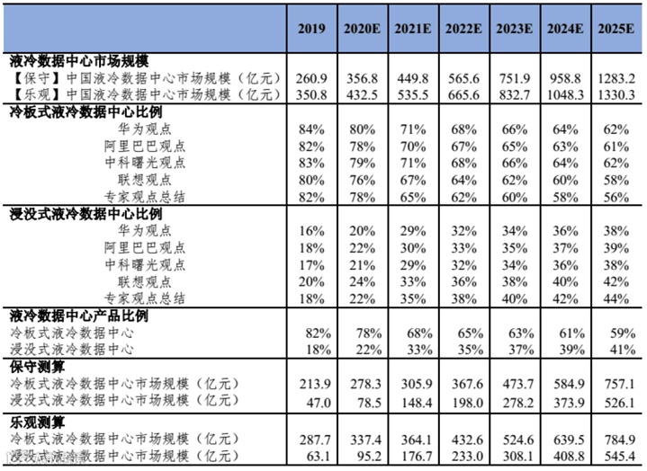 根据《中国液冷数据中心发展白皮书(2020)》,保守情况下,我国数据中心2019年的市场规模为260.9亿元,预计2025年达1283.2亿元,其中,浸没式液冷的市占率逐年提升,2019年浸没式液冷的市场规模为47.0亿元,预计2025年达526.1亿元,CAGR为49.56%;乐观情况下,2019年的市场规模为63.1亿元,预计2025年达545.4亿元,CAGR为43.26%。同时,根据英维克(002837.SZ)数据,温控设备占数据中心成本的16.7%;根据施耐德电气数据,制冷系统占数据中心成本的20.1%(20kW/机柜)。按照平均18.4%计算,预计2025年浸入式液冷散热系统的市场规模为109.63亿元。