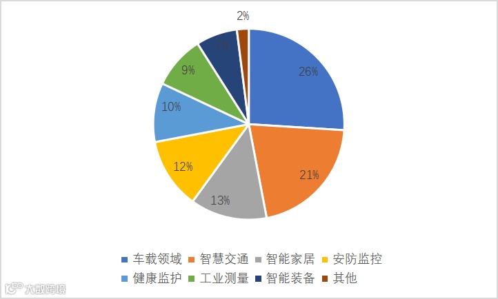 根据AIOT星图研究院数据,中国毫米波雷达在车载应用布局最广泛,占比达26%,其次是智慧交通领域的21%。车载、智慧交通、安防监控、智能家居前四类业务布局占比超过70%。