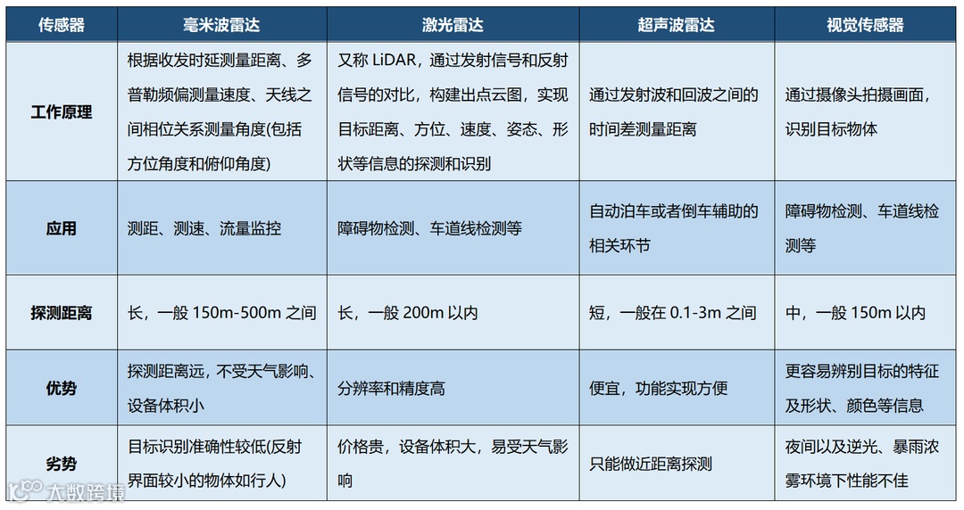 表1:不同雷达及其他传感器对比