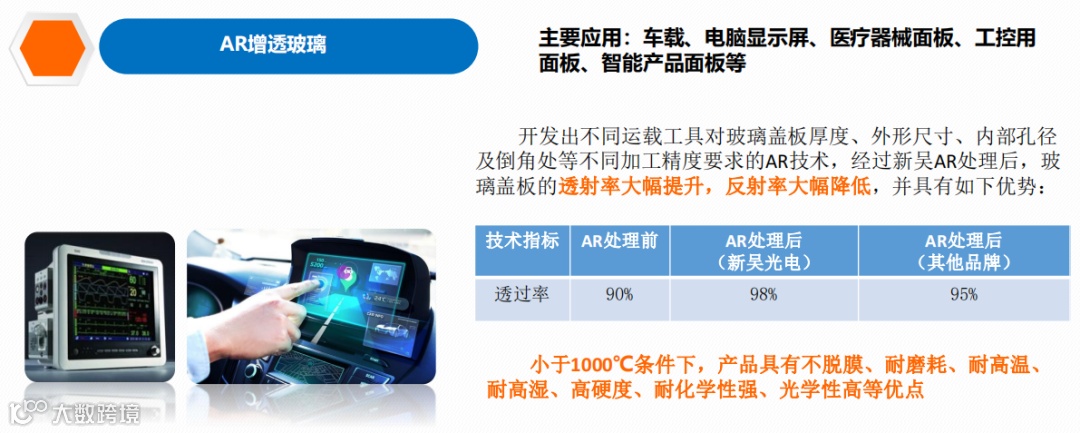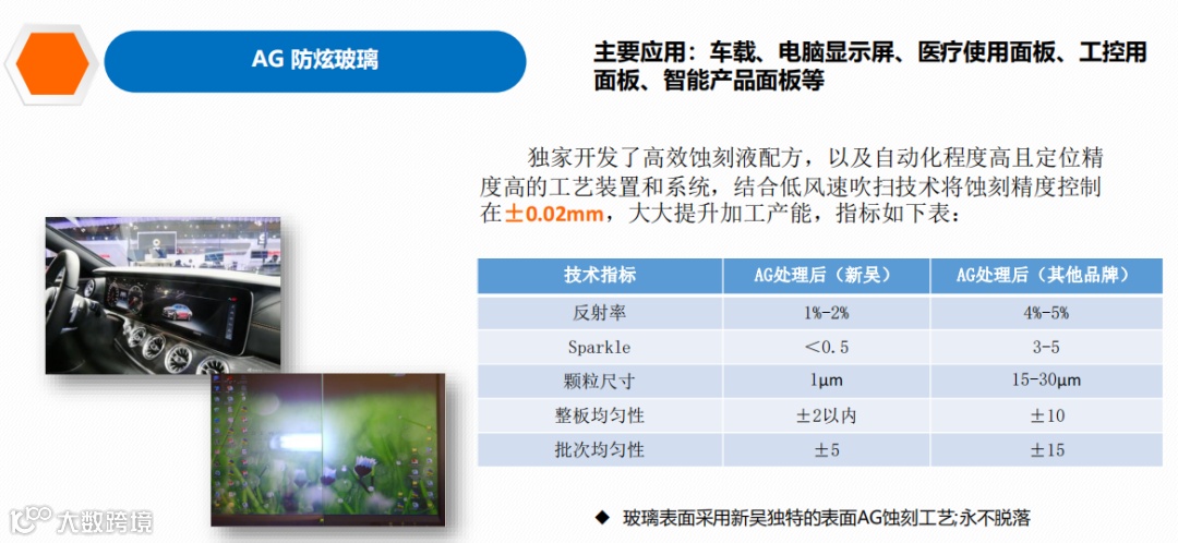 新吴光电长期聚焦于屏显细分领域,工艺精湛,技术领先,生产的玻璃盖板具有强度高、透光率好、韧性强、抗划伤、抗油污、聚水性出色等特点,目前为全球领先的A-GRF全产业链玻璃盖板生产企业,美国康宁车载AG玻璃盖板独家供应商,新吴光电在高端A-GRF盖板玻璃细分领域处于世界前列,为该细分领域的隐形冠军。