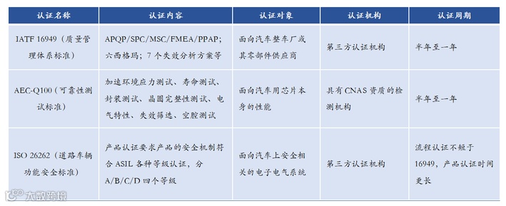 国际汽车电子协会主要推出三种标准规范:AEC-Q100可靠性标准、供应链质量管理标准IATF 16949规范、ISO26262标准的ASIL功能安全保证级别,产品认证体系严格。