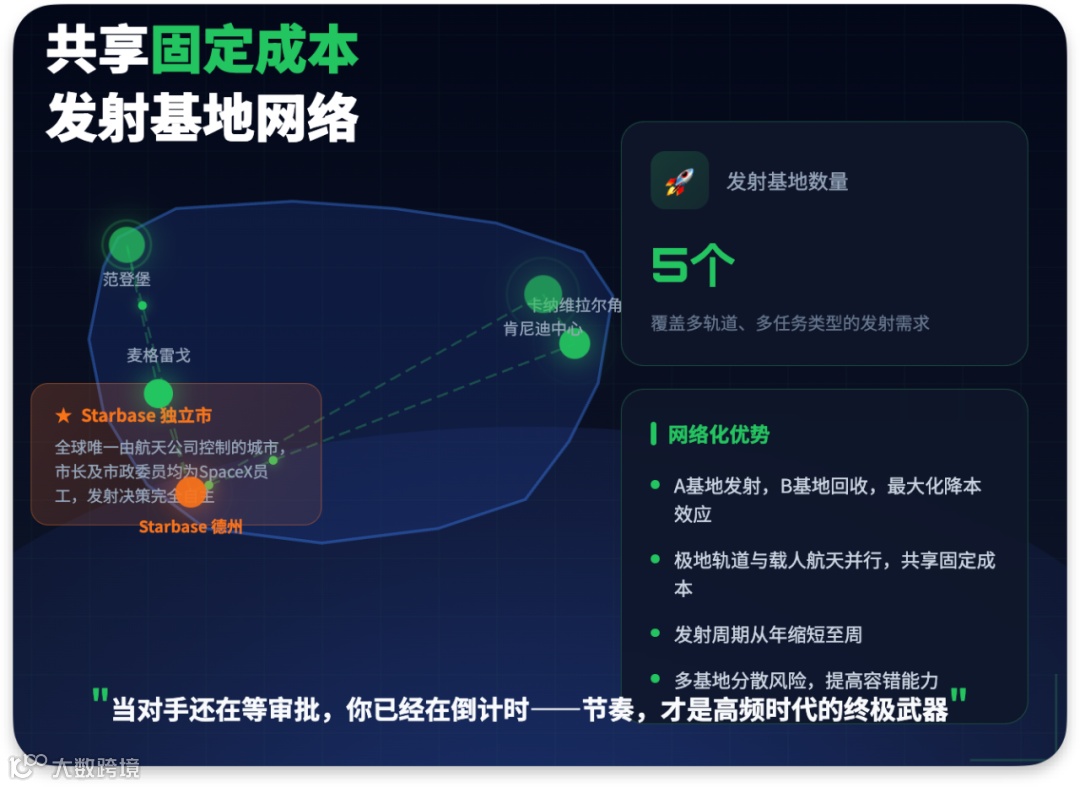 发射基地网络→摊销固定成本:地理分散的发射场网络支持高频、多轨道发射