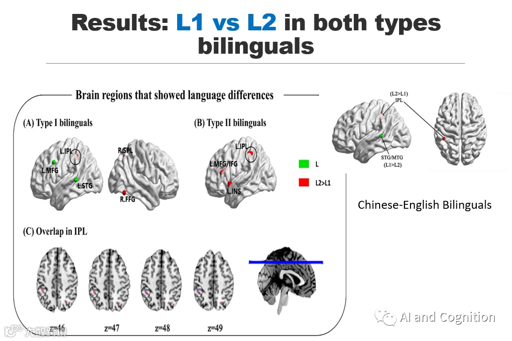 在元分析研究中,丁教授团队的研究发现:以汉语图形图像文字为母语的双语者(Type IBilinguals),与以英语、德语为代表等字母文字为母语的双语者(Type II Bilinguals)相比,两者在L2>L1(二语与一语相比)后激活的脑区有诸多不同,但在左侧IPL这个脑区却存在较为类似的激活。因而IPL这个脑区在二语学习中的作用值得注意。
