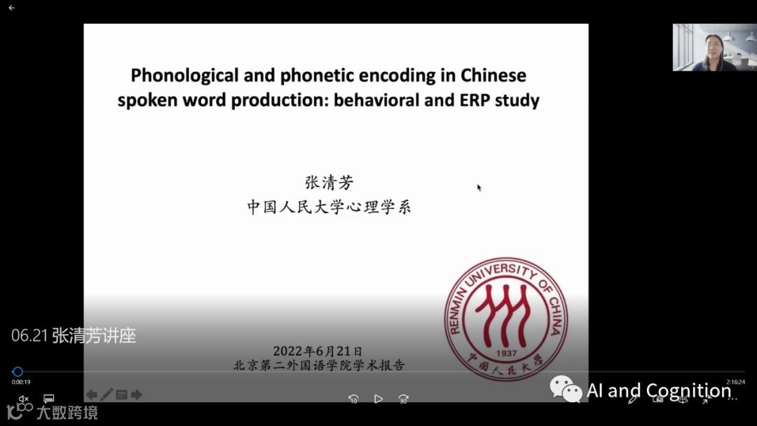 6月21日下午,人工智能与语言认知实验室邀请中国人民大学张清芳教授作“汉语口语词汇产生中的音韵编码和语音编码过程:行为和事件相关电位研究”的讲座。张清芳教授中国人民大学心理学系教授、博士生导师。中国英汉语比较研究会心理语言学分会常务理事,中国语文现代化学会神经语言学研究会理事。在Brain and Language, Neuropsychologia, Psychophysiology, QuarterlyJournal of Experimental Psychology, Applied Psycholinguistics,《心理学报》等国内外期刊发表学术论文70余篇。张清芳教授的讲座的主题为汉语口语词汇产生过程中音韵编码和语音编码的神经机制。她分别比较了音节效应与音段效应、音节效应与音素效应,发现较为恒定的音节启动效应;在考察音节的加工顺序时,证实了汉字自左而右的加工过程;她还基于时频分析、元分析以及不同任务考察了音节加工与theta波的关联以及音节效应在口语产出过程中出现的具体阶段。最后,她基于研究结果总结出口语产出的可能工作模型。共有70余名我校以及外校师生在线上聆听了这场讲座。