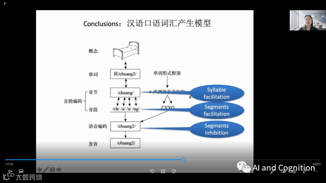 在上述研究结果的基础上,张清芳教授进一步总结出汉语口语词汇产出的工作模型(如上图)。按照该模型,汉语口语的音韵编码经历了“音节-音段-语音编码”然后到发音的过程。