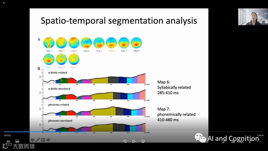 基于Levelt等学者(1994)的口语产出通用模型、以及O’Seaghdha等学者(2010)关于汉语与英语口语产出的语言特异性模型,张清芳教授考察汉语音节中CV模式(如:企-气球)以及CVN模式(如:顷-蜻蜓)与音段重叠条件之间的行为与脑电成分差异,研究发现了较为明显的音节启动效应,并观察到不同音节模式在300-400毫秒之间在右前、中后以及右后存在显著的交互作用,但音段重叠条件仅仅在加工晚期才在中前、中后以及右后出现了微弱的交互作用。而在后续研究中,她们继续比较了汉语音节重叠与音素重叠两种条件在相关/不相关情况下的神经机制,研究再次发现了汉语音节重叠条件相对于音素重叠条件在200多毫秒到400毫秒之间存在显著差异。她们基于Cartool软件进行的空间-时间微状态分析进而揭示两者在加工时段上存在明显的差异。