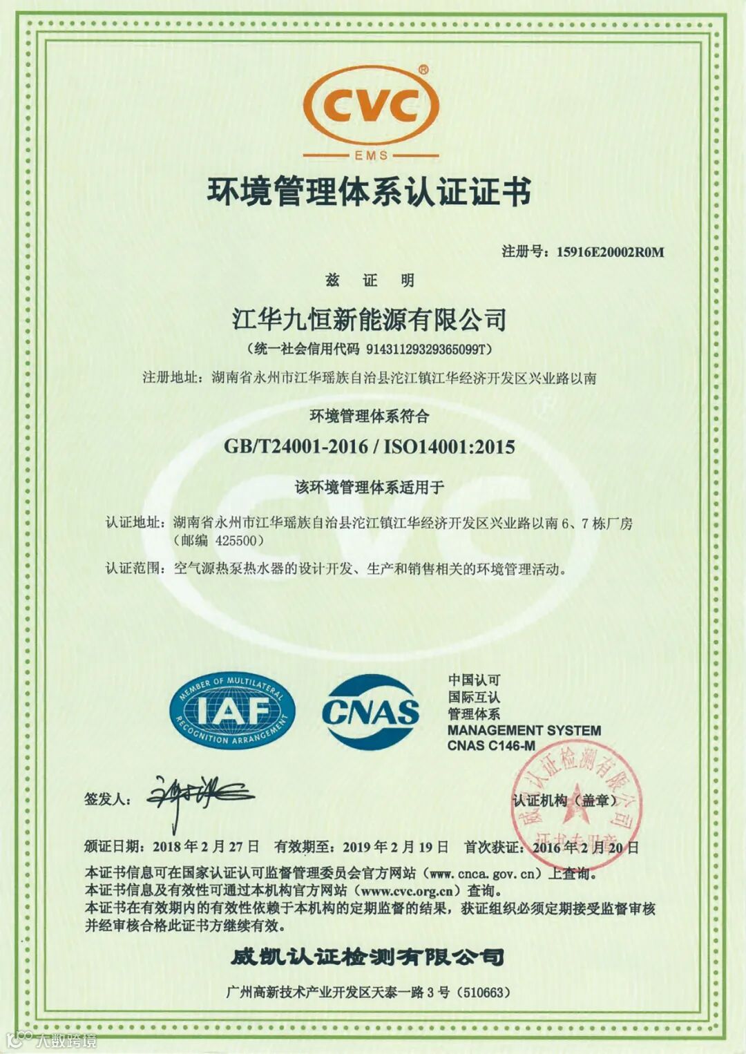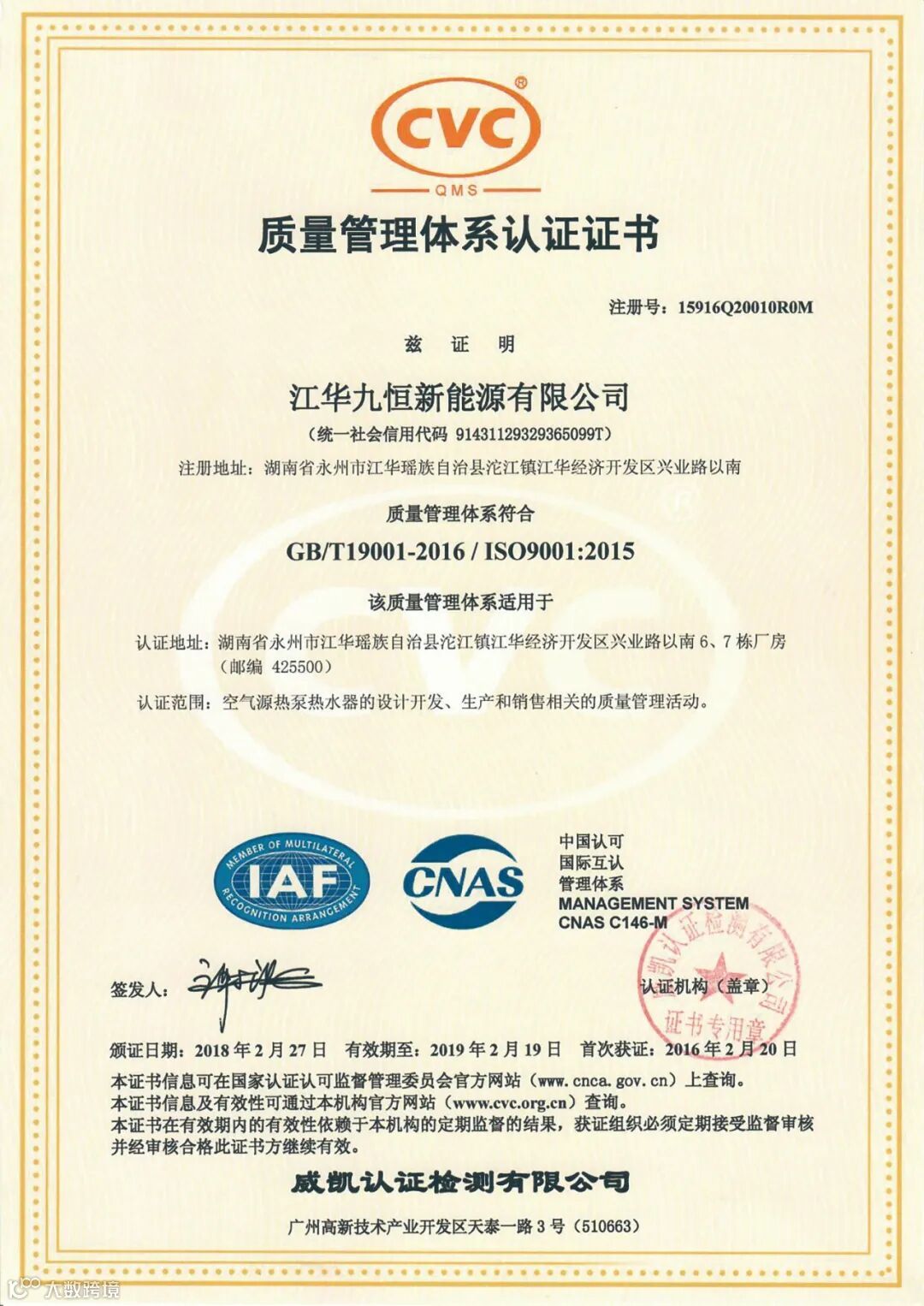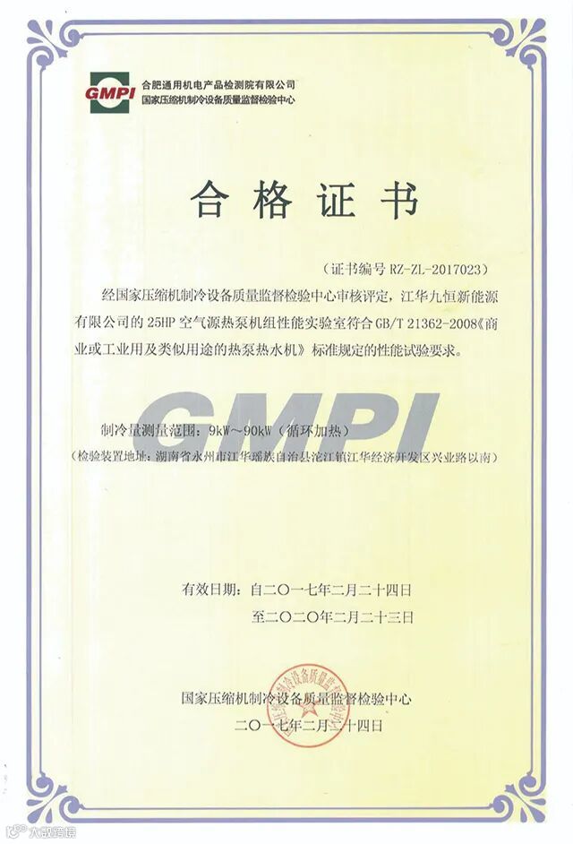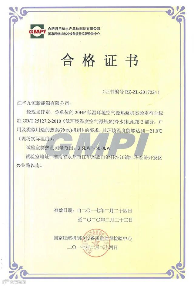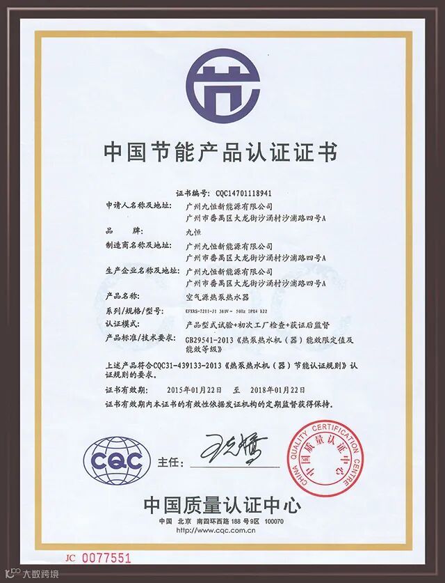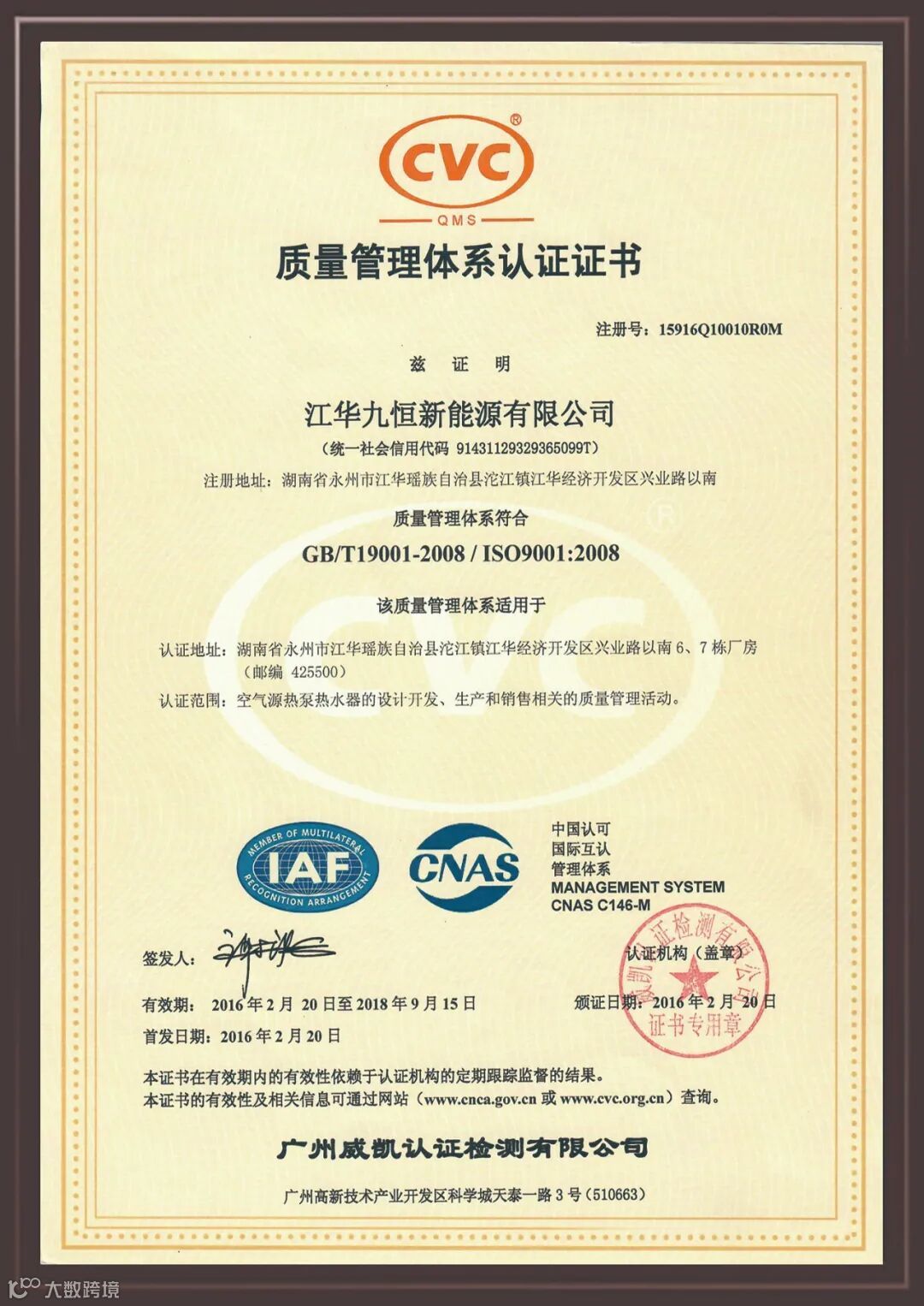 九恒公司全面通过ISO9001质量管理体系认证、ISO14001环境管理体系认证、建有国内领先的低温热泵性能实验室,全线产品取得美国UL、欧洲CE、国内3C认证,在行业中最早获得全国工业产品许可证,拥有生产各种大型空气能机组的资质和条件,公司先后获得各种技术专利40多项,产品远销到欧洲、美洲、澳洲、非洲等30多个国家,应用于生活热水、空调、采暖、干燥等各个领域,产品的先进性,稳定性、经济性获得用户广泛好评。