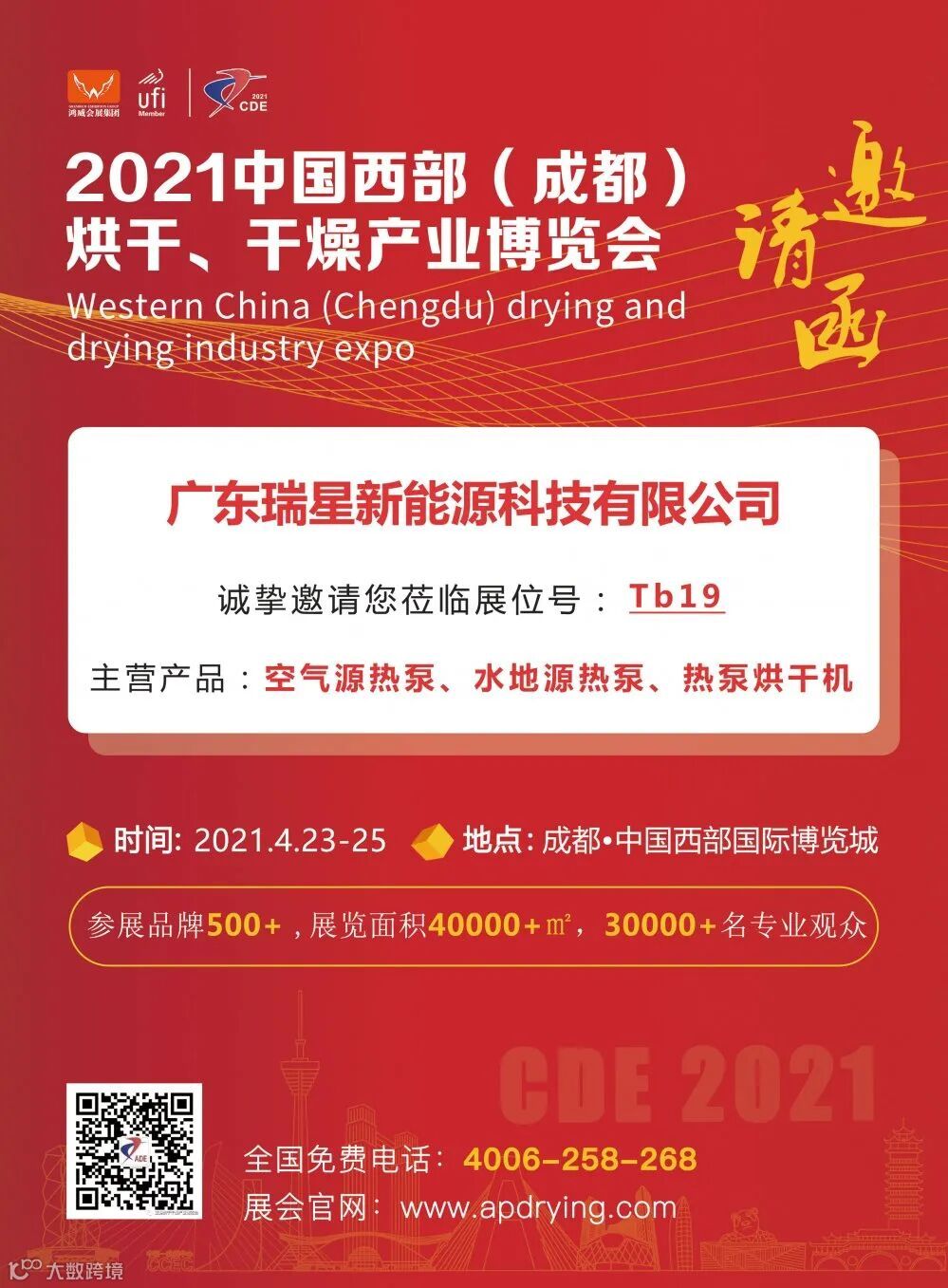 广东瑞星新能源科技有限公司将精彩亮相于2021年4月23-25日在成都·中国西部国际博览城隆重举办的2021中国西部(成都)烘干、干燥产业博览会的 Tb19 展位。欢迎全球各专业买家光临参观、洽谈合作。