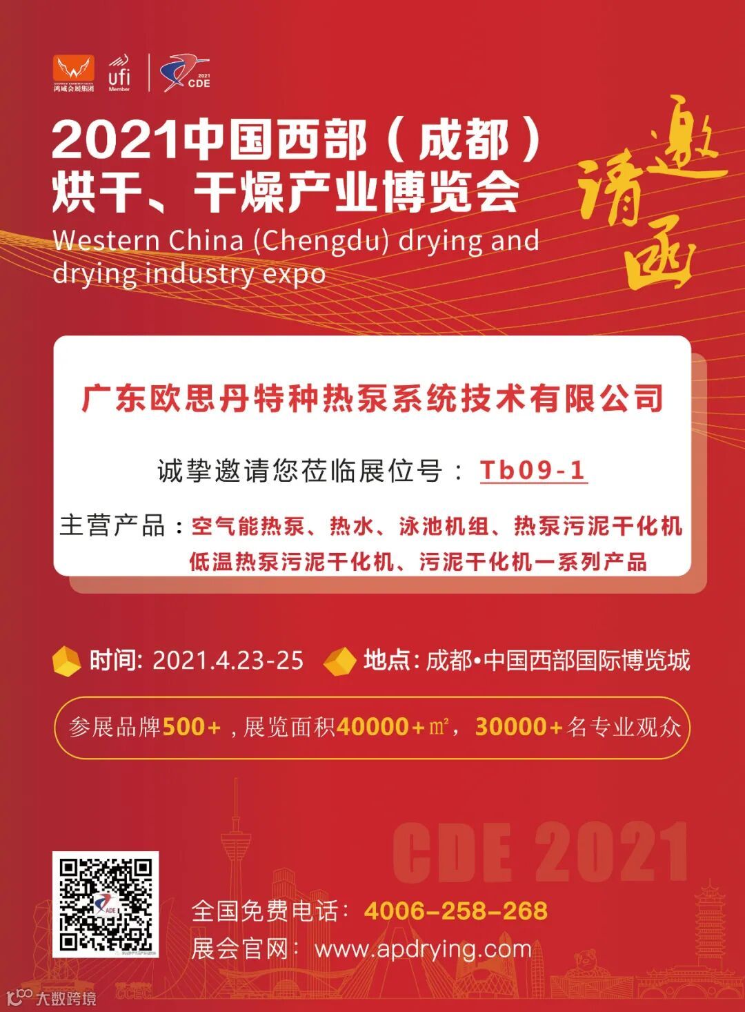 广东欧思丹特种热泵系统技术有限公司将精彩亮相于2021年4月23-25日在成都·中国西部国际博览城隆重举办的2021中国西部(成都)烘干、干燥产业博览会的 Tb09-1 展位。欢迎全球各专业买家光临参观、洽谈合作。