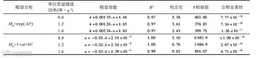 吕为乔等人在单位质量微波功率为0.8、1.2、1.6 W/g (干基) 的条件下,对姜片进行干燥,分析实验结果,发现Page模型与Wang-Singh模型均能够描述姜片干燥过程,为得到最佳模型, 作者对两个模型的数据进行了对比,见表1,WangSingh模型的决定系数R2最接近于1,WangSingh模型显著性分析的F值最大且为非常显著,均方误差小于Page模型。最终判定Wang-Singh模型最适合微波干燥姜片的干燥过程。