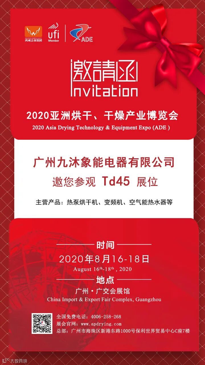广东九沐新能源设备有限公司将精彩亮相于2020年8月16-18日在广州-中国进出口商品交易会展馆隆重举办的2020亚洲烘干、干燥产业博览会,亚洲热泵技术及设备展(AHP)的 Td45 展位。欢迎全球各专业买家光临参观、洽谈合作。