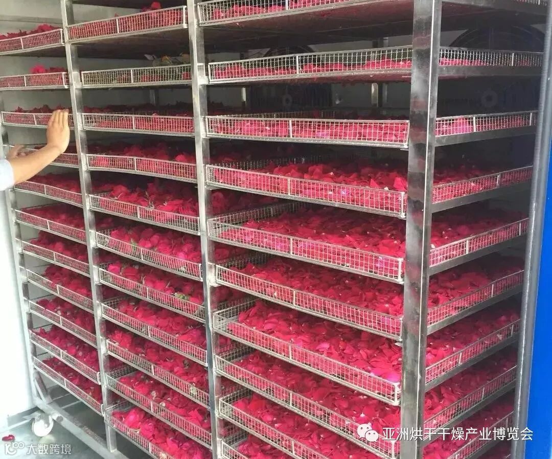 玫瑰花烘干过程中,应通过观察孔,随时观察其颜色及水分的变化,排潮好,颜色才鲜亮;最下层玫瑰花烘的过干才出箱,适当的含水率放出后摊晾即可。