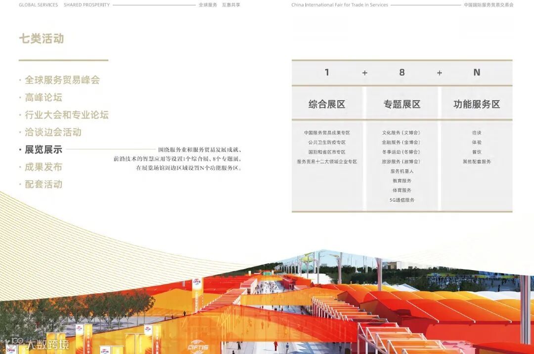 "1+8+N" refers to comprehensive exhibition area, including China's Service Trade Achievements Zone, Public Health and Epidemic Prevention Zone, Country and Province Zone and Enterprise Zone in 12 Sectors of Trade in Services; the eight thematic exhibition areas are cultural services, financial services, world winter sports expo, tourism and travel-related services, service robots, education services, sports services and 5G communications services; the N functional service areas are for supporting services such as business talks, self-experiencing and catering.