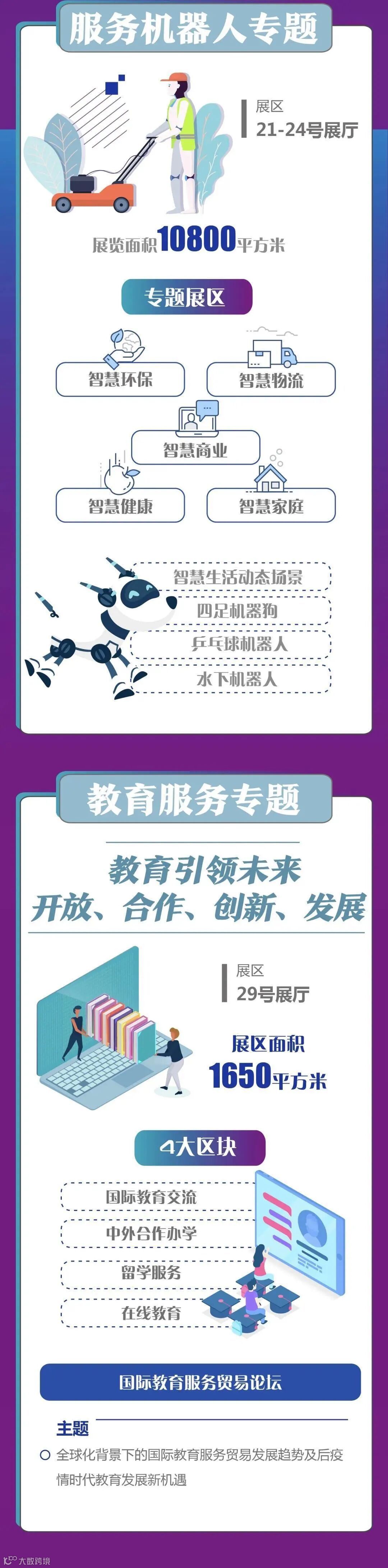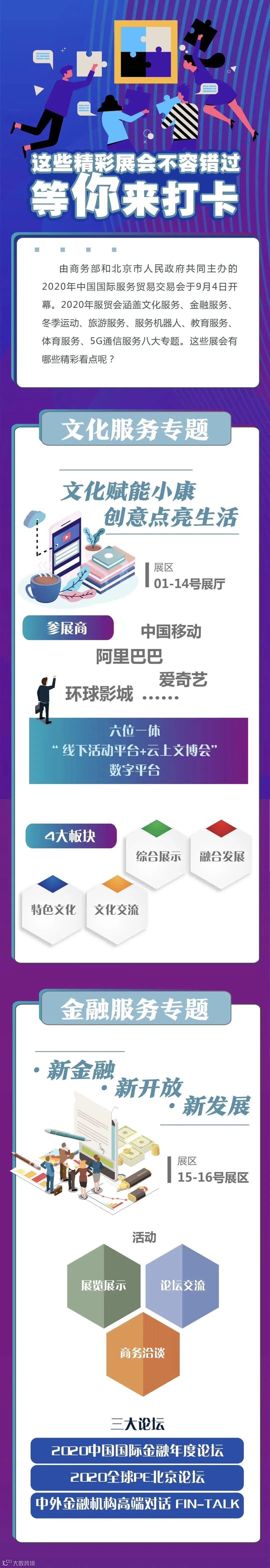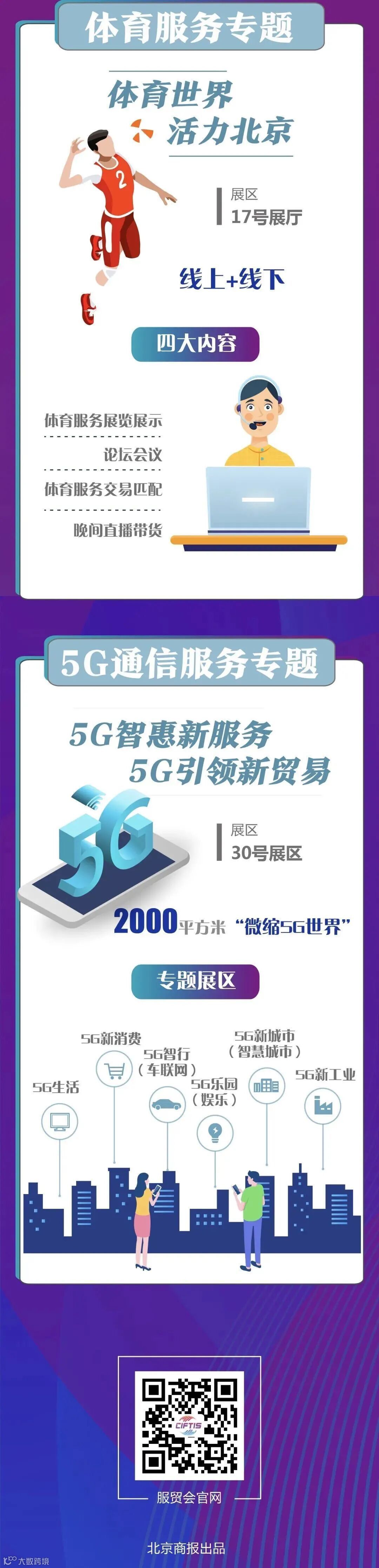 听起来高大上的服务贸易其实离我们并不遥远。本届服贸会涵盖的文化服务、金融服务、冬季运动、旅游服务、服务机器人、教育服务、体育服务、5G通信服务八大专题,每个都与百姓的日常生活息息相关。本届服贸会上,这些展区都有哪些看点?让我们一图在手,精彩尽在掌握。