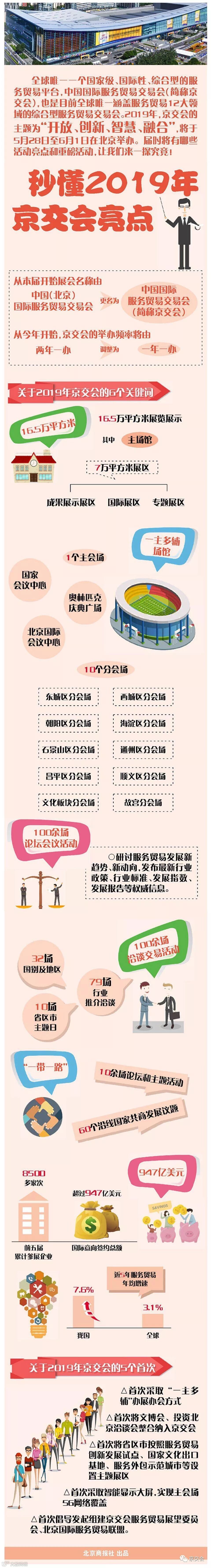 服贸会2019年京交会将于5月28日至6月1日在国家会议中心举行。如何高效融入这场国际化的服务贸易大会?两张图速览今年京交会亮点,提前看准热门论坛和展览,捕捉服务贸易新机会!