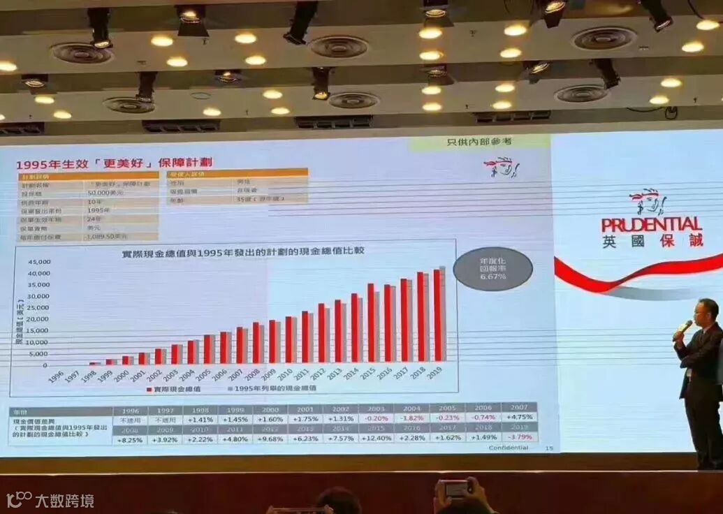 1995客户投保的保诚分红产品“美好人生”实际复利回报高达6.67%,与计划书演示分红实际达成了高于100%。