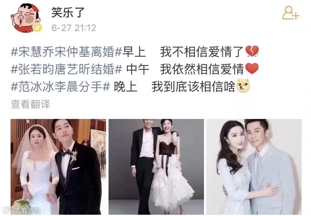 6月27日可能是国际分手日。宋慧乔宋仲基离婚的热度还没过,范冰冰和李晨就官宣分手了。吃瓜群众们的一天的情绪起伏是这样的: