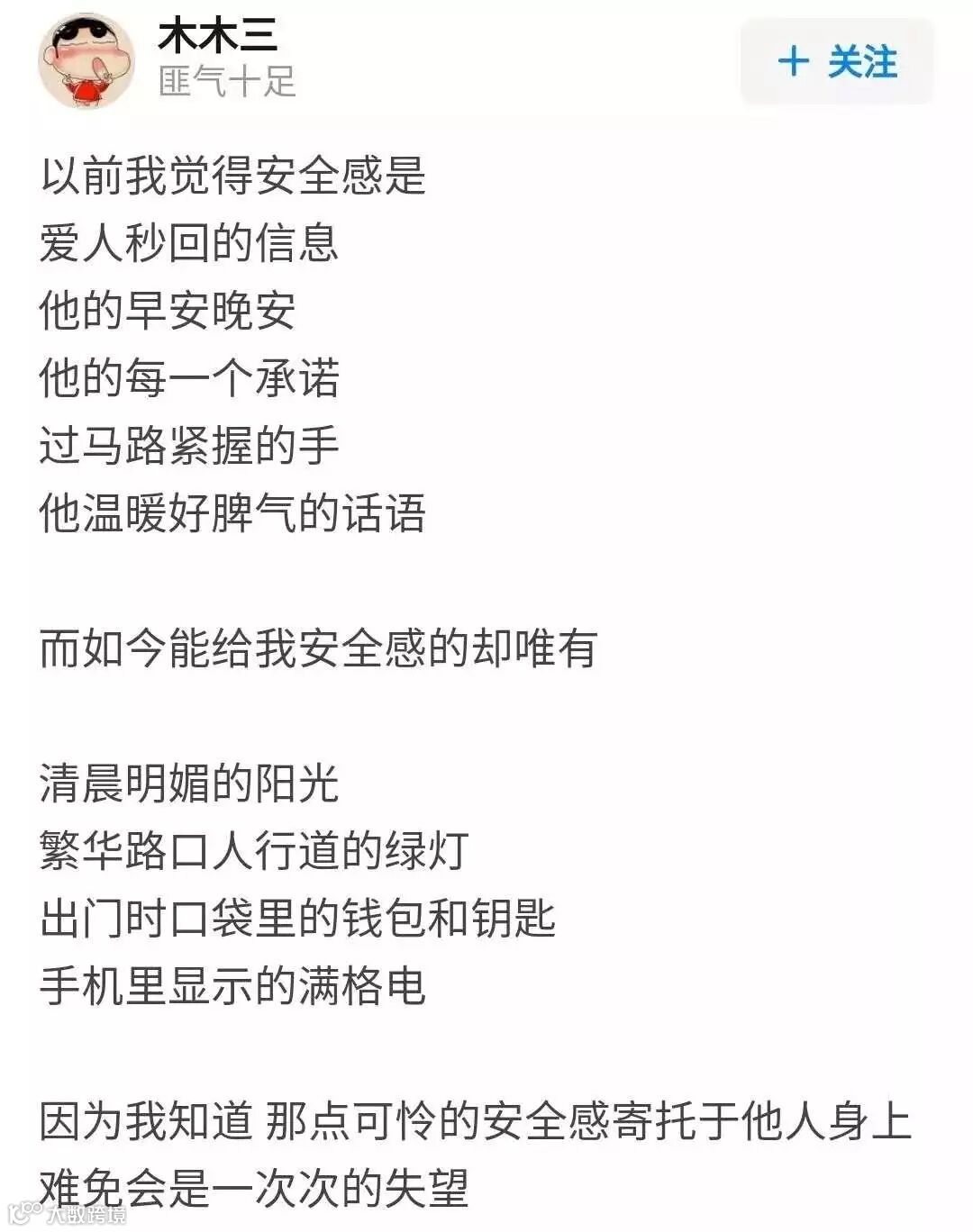 惟有当你认清世间一切事物都是无常的事实,你才明白,安全感从来无法外求,它来自你内心的平安,来自你物质生活的无忧。女人有钱有房有保单,比有对象更有安全感。
