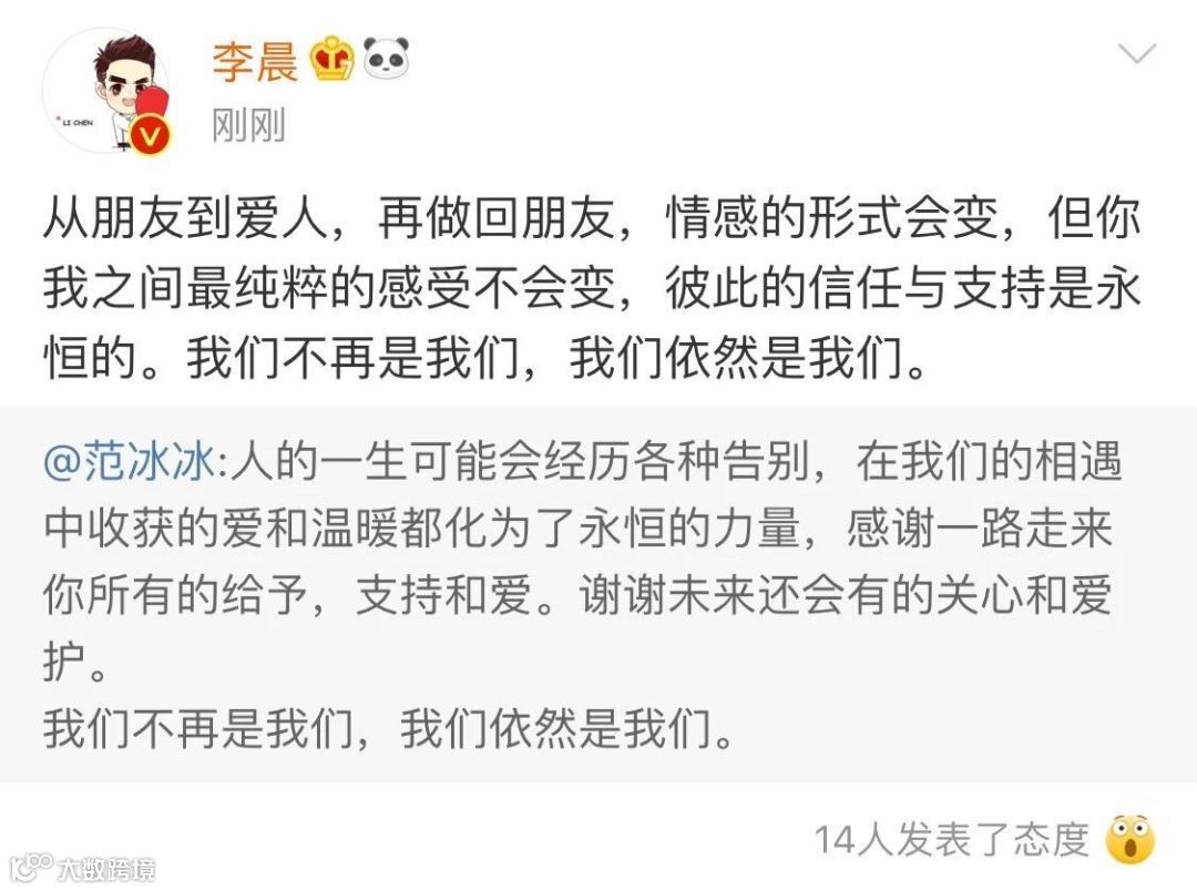 然而就在四年前,范冰冰和李晨大方宣布恋情,微博上双双写着:我们。