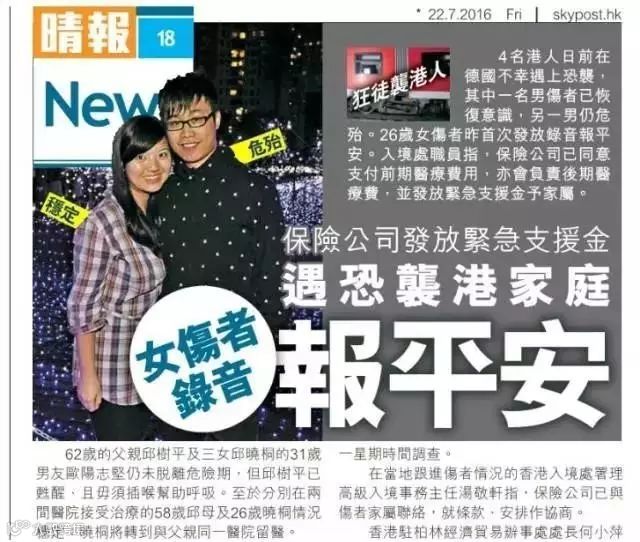 今年7月,德国火车斩人事件,造成4名港人受伤。香港社会福利署随即决定批出紧急援助金予德国火车伤人遇袭案的两个家庭,每个家庭获批5万港币,共10万。保险公司除了像伤者家属提供紧急援助金外,并答应承担医药费以及稍后的医疗运送费用,理赔后续展开。