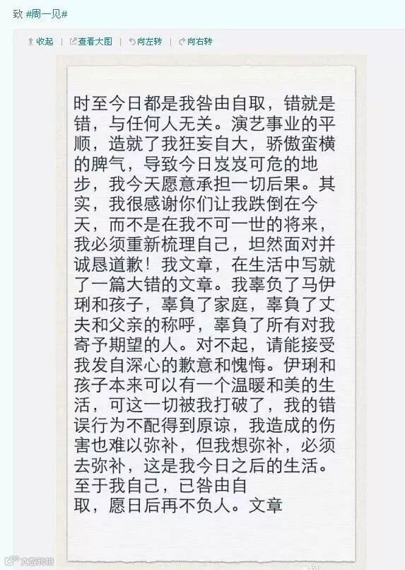 文章在2014年3月底发表了一篇长文承认自己的错误,说自己所做的这一切都是咎由自取,并不关任何人的事情。