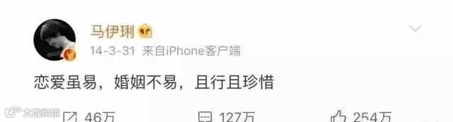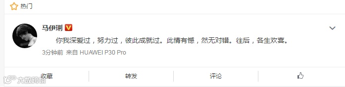 随后马伊琍发布微博:你我深爱过,努力过,彼此成就过。此情有憾,然无对错。往后,各生欢喜。