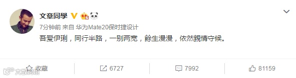 7月28日下午15时许,文章在微博发文,看内容疑似承认已与马伊琍离婚:吾爱伊琍,同行半路,一别两宽,余生漫漫,依然亲情守候。