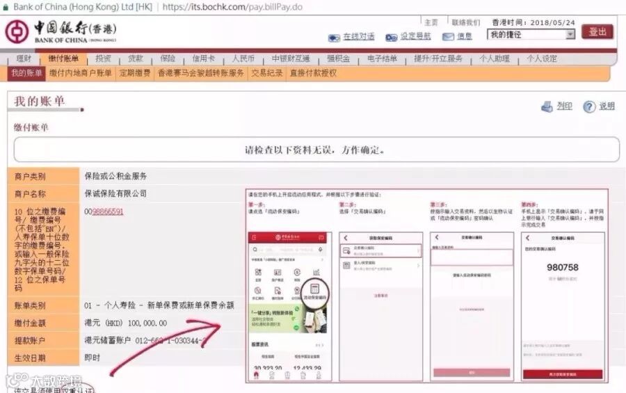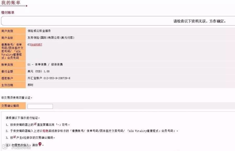 第六步:核对账单资料 并 用手机程式 及 流动保安编码 进行双重验证。