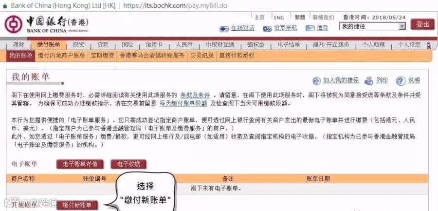 进入网银系统后,菜单栏目选择 “缴付账单”,并在 “我的账单” 内选择 “缴付新账单”。