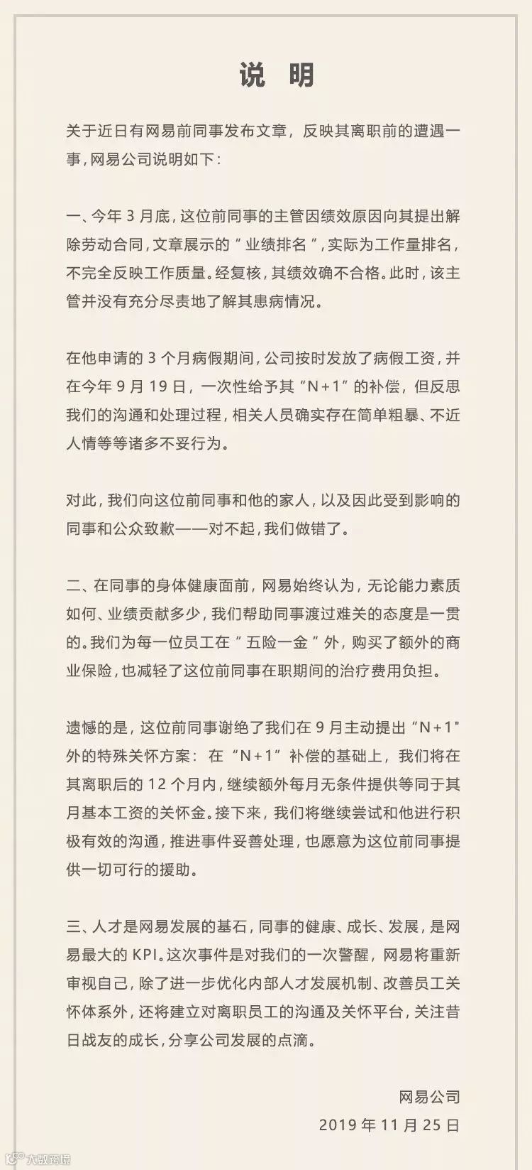2019年11月25日上午,网易方面第一时间提供了关于“暴力裁员”的说明。网易方面承认在沟通和处理过程,相关人员确实存在简单粗暴、不近人情等等诸多不妥行为,并向当事人道歉,表示愿意为这位前同事提供一切可行的援助。同时,网易方面也透露,经复核,当事人绩效确不合格。