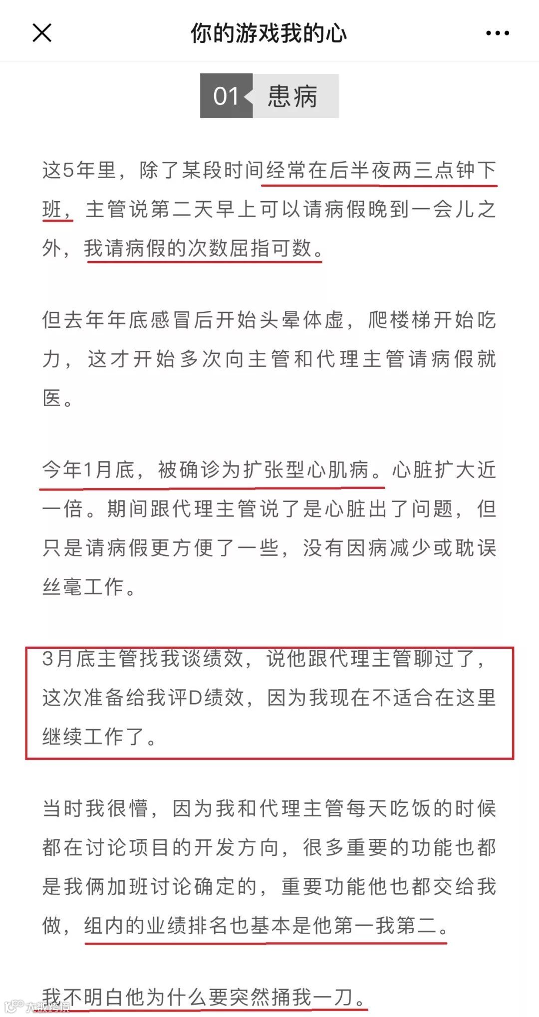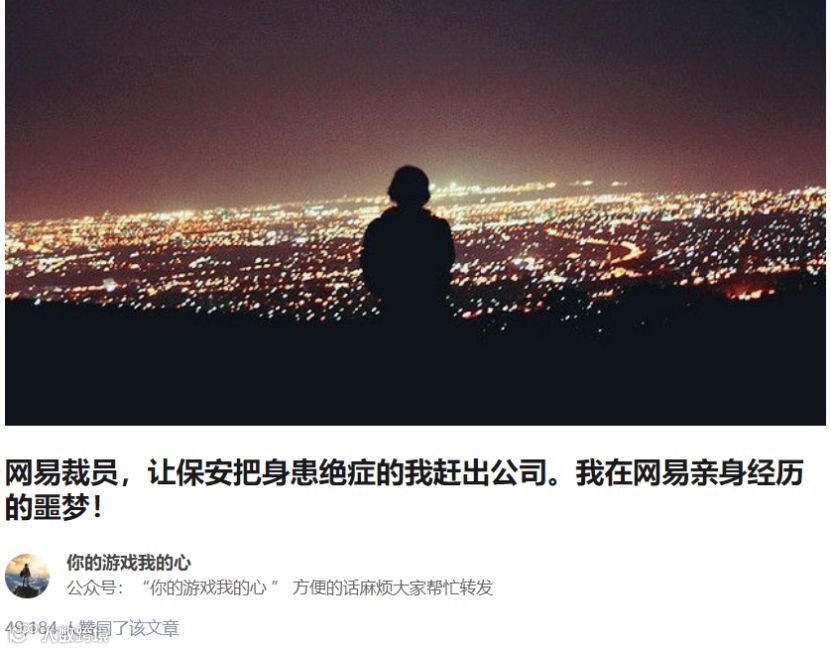 2019年11月24日,有一篇名为《网易裁员,让保安把身患绝症的我赶出公司。我在网易亲身经历的噩梦!》的文章在朋友圈流传,文章作者称自己在网易游戏遭遇多种不公平待遇。