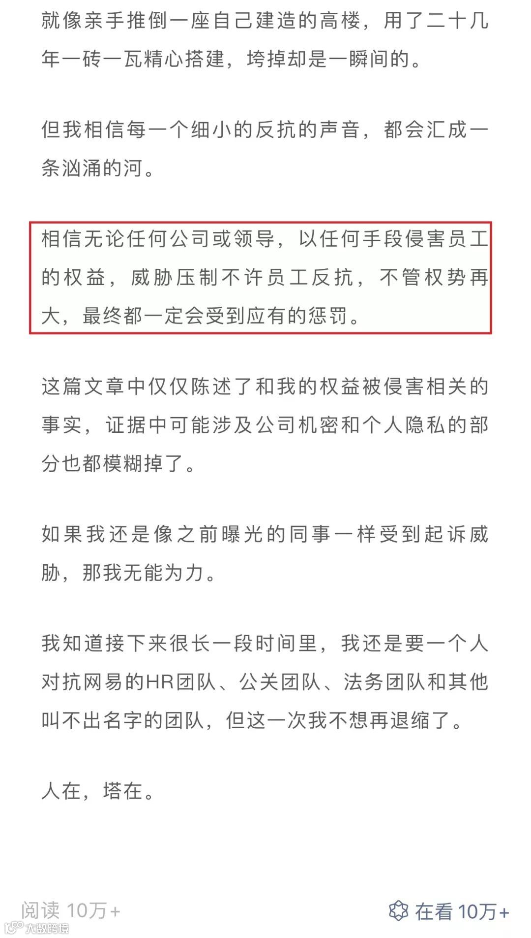 据网文爆料,在当事人绩效并不差的情况下,网易强行要求该名患绝症员工离开公司,并威胁该名员工,如果要裁员补偿会对员工未来产生不利影响。多轮周旋后,该名员工被保安强行赶出公司。