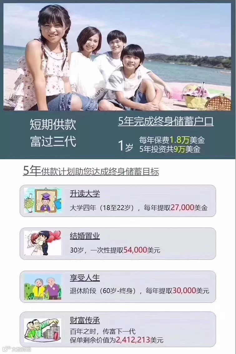 数据一: 1岁宝宝,五年交,每年1.8万美金,5年共9万美金