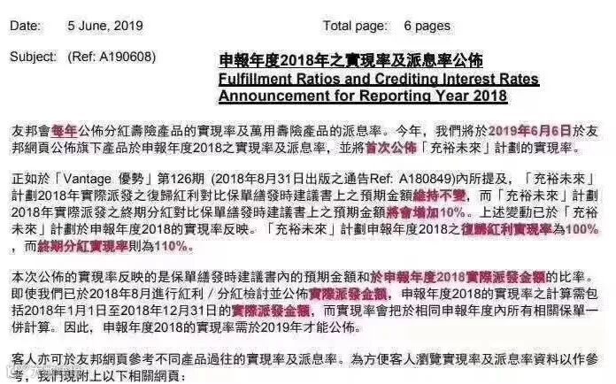 2019年6月5日,香港友邦公布王牌储蓄产品“充裕未来计划”的分红实现率,2018年度复归红利实现率为100%,终期分红实现率为110%。