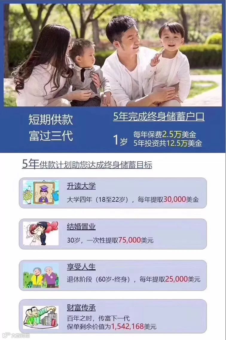 数据二: 1岁宝宝,五年交,每年2.5万美金,5年共12.5万美金