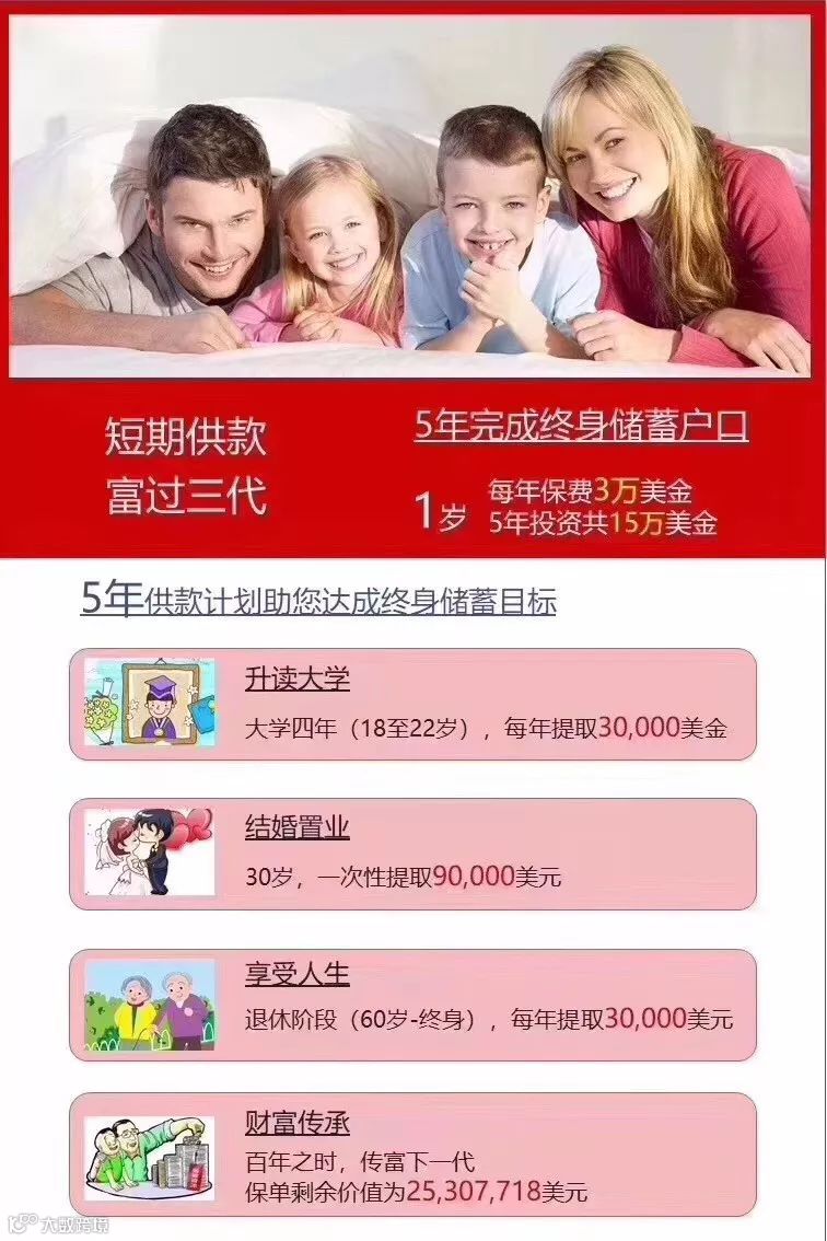 数据三: 1岁宝宝,五年交,每年3万美金,5年共15万美金